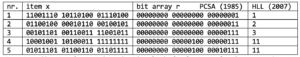The table below shows the bookkeeping used by PCSA and HLL for the first 5 items of a given bucket. For the sake of comparison, HLL is presented as counting trailing ones, instead of leading zeros [5].